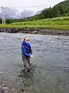 Birte Hansen Nordgård på fluefiske i Jægervasselva i Nord-Troms. Hennes hobbier er fluefiske, klatring, randoneeski og fjellturer, samt svømming.