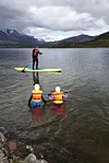 Brettpadling på Vatnevatnet utenfor Bodø med tvillingene Thea og Teodor som tilskuere.