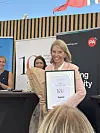 Siri Teigum mottok prisen på et arrangement i regi av Kapital på Arendalsuka.Foto: Wenche Huser Sund