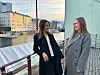 Advokatfullmektiger i Judicia, Henriette Aarsund og Amalie Vindsnes Haram. Her foran Hotel Brosundet i Ålesund sentrum og med utsikt mot byfjellet Aksla.Foto: Kari Hegstad