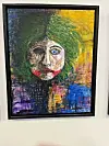 Det er et fargerikt portrett. Det hvite ansiktet i sentrum