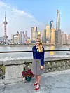 Therese Trulsen fotografert i Shanghai. I bakgrunnen ses fra v. Oriental Pearl Tower, Jin Mao Tower, Shanghai World Financial Center og Shanghai Tower.Foto: Privat