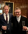 Mads Andenæs og Eirik Bjørge under en mottakelse på den norske ambassaden i London etter utdelingen. – Jeg har ikke hørt noe som kan måle seg med talene på mottakelsen på den norske ambassaden dagen han avla KC-eden til den britiske Lord Chancellor. Den britiske høyesterettsjustitiarius, lord Reed, og lederen for de engelske advokatene, Kirsty Brimelow, sa ikke bare at Eirik Bjørge er enestående, men at hans forfatterskap legges til grunn i britiske domstoler, EMD og Den internasjonale domstolen, sier AndenæsFoto: Privat