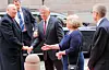 Kong Harald ankom markeringen av justitiariusskiftet og ble møtt av avtroppende Tore Schei og påtroppende Toril Marie Øie. Til høyre Gunnar Bergby. Foto: Høyesterett