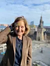 Christin Bøsterud på terrassen i EYs nye lokaler på Stortorvet i Oslo, dit firmaet flyttet i fjor sommer, etter over tjue år i Bjørvika.Foto: Nina Schmidt