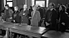 De tiltalte i Listasaken mottar dommen, fra v. Ivar Johansen, høyesterettsadvokat Ole Jakob Bae, Jan Otto Hauge, Ingolf Håkon Teigene, advokat Kjell Amundsen og Trond Jensen. Foto: Erik Berglund / NTB Scanpix