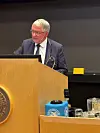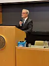 Dommer i EFTA-domstolen, Michael Reiertsen, snakket om utviklingstrekk i EØS-retten.Foto: Nina Schmidt