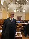 Tidligere høyesterettsjustitiarius Carsten Smith, som regnes som sameparagrafens far, tok turen til Høyesterett i dag for å følge saken. Her med Thoralf Henriksen fra Guttormgruppen.Foto: Nina Schmidt