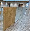 Flere glasspaneler på rekkverk rundt atriet er knust