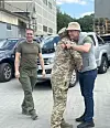 Lars Berge Andersen møter en soldat fra brigade 223 under overlevering av en lastebil i Lviv.