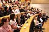 Spente deltagere i salen før Oslo Legal Hackathon startet fredag ettermiddag.